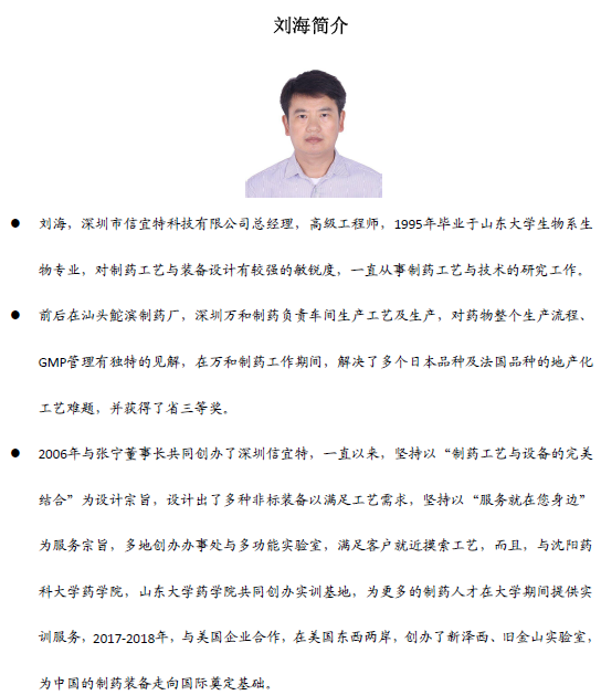 屆時,深圳信宜特為了回饋客戶,除了提供專業制藥裝備服務之外,特邀沈陽藥科大學崔福德教授,聊城大學生物制藥研究院院長韓軍教授,浙江大學藥學院李文龍博士,沈陽達善醫藥研發總監姜海濤博士,北京中醫藥大學徐冰博士,長沙晶易醫藥研發總監張海龍等數名國內專注于固體制劑工藝研究的實戰專家學者,為客戶面對面解答行業問題,專家將從粉體/顆粒學基礎理論介紹,到“一致性”工藝開發要領,最后實現穩定可靠的產業化數據,多方面,深層次,以“高效仿制與產業化”為主旨進行探討,解讀及案例分析。歡迎制藥同仁踴躍報名參會。